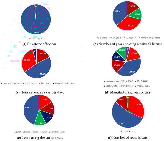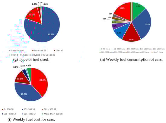 In this section, the results of the usage of vehicles are presented. As shown in Figure 7a, the survey data shed light on the respondents’ usage and car ownership habits. A mere 1.4 percent of those surveyed have an automobile given by their employer, whereas the majority of participants, at 98.6 percent, own a private vehicle. This study investigated the length of time that the participants have held a driver’s license, and the results are presented in Figure 7b. About 15.9% of drivers have one to five years of driving experience, while 13.0% have between 6 and 10 years. With 34.1 percent of the respondents having a driver’s license for 11–20 years and 37.0 percent for more than 20 years, a larger percentage of the sample has more extensive driving experience. Figure 7c shows the participants’ journey times regarding daily car usage. Less than an hour is spent in a car every day by 16.5% of the respondents. About 44.5 percent of the respondents, by far the largest percentage, said they drive for one to two hours every day. A sizable portion of people—28.6 percent—said they spend three to four hours every day in their cars. Four percent of the participants said they drive more than six hours a day, which is a smaller percentage. When it comes to the age of cars, as shown in Figure 7d, the majority of the respondents (39.6%) reported that their cars were manufactured between 2011 and 2015. About 17.6% of the participants reported that their vehicles were manufactured between 2000 and 2010, while 15.9% were manufactured between 2016 and 2017. Of the total automobiles, 12.1 percent of the respondents reported their cars were manufactured in 2020 or later, and 11.0 percent reported their cars were manufactured between 2018 and 2019. Merely 3.8 percent of the respondents said that their automobiles were manufactured before 2000. Regarding the duration of car ownership, a significant 45.1% of participants have been using their current car for more than five years. Those who have had their car for one year represent 15.9%, followed closely by those with two years of ownership at 13.9%. The percentages of respondents who have used their car for three and four years are 12.4% and 12.7%, respectively, as shown in Figure 7e. Using the number of seats as a proxy for vehicle capacity, Figure 7f illustrates that 54.0% of the respondents reported that their cars could fit five or six people. Of the participants, 31.5 percent own a smaller car with four seats, while 13.0 percent own a larger car with nine seats. Only 1.4 percent of the respondents own a vehicle with room for eleven passengers. Figure 7g demonstrates that the majority of car owners utilize gasoline 91, which is used by 80.6 percent of car owners, while 15% reported the fuel used is gasoline 95%, and 2.6% reported diesel. The findings also show that less than 2% of the respondents use a hybrid car. Regarding weekly fuel consumption, Figure 7h shows that the largest group of participants, at 29.2%, uses between 51 and 100 L of fuel. This is followed by 16.2% of participants who use 101 to 150 L and 12.7% who use 0 to 50 L. Notably, 18.2% of the respondents are unsure about their fuel consumption. In terms of weekly fuel expenses, as shown in Figure 7i, a significant portion of the respondents, at 38.7%, spend between SR 151 and 300. Another large group, at 38.4%, spends between SR 0 and 150. The survey data show that 13.3% of the participants spend between SR 301 and 500, and a smaller group of 3.8% spend between SR 501 and 600. The findings also show that about 5% spend more than SR 600 per week.