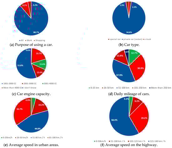 In this section, travel options for the community in Hail City are presented. As seen in Figure 8a, 88.7 percent of the respondents said that their main usage of automobiles is for all purposes, which can include personal errands, commuting, and other activities. The percentage of respondents reporting that their cars are used only for work and shopping is far lower, at 8.1 percent and 3.2 percent, respectively. In terms of car types, as shown in Figure 8b, the vast majority of respondents, 94.8%, drive private sedans. Special cars and trucks are less common, at 2.3% and 2.9%, respectively. Regarding engine capacities, a sizable portion of participants—55.8 percent—do not know the engine capacity of their vehicles, as shown in Figure 8c. Of those who are aware, 19.7% drive vehicles with an engine capacity between 2001 and 3000 CC, 11.6% reported an engine capacity between 3001 and 4000 CC, and 12.4% reported an engine capacity of more than 4000 CC. The percentage of respondents with a car with an engine capacity between 1001 and 2000 CC was only 0.6%. The survey data show that the majority of the respondents, at 37.9%, travel between 51 and 100 km per day, as shown in Figure 8d. The next largest group, at 30.9 percent, makes daily trips of 26 to 50 km, which agrees with the findings published by Elshurafa and Peerbocus [38]. A smaller proportion, at 13.9 percent, travel between 101 and 250 km daily, while 12.7 percent of the participants travel less than 25 km. At 4.6% of the respondents, the lowest proportion is among those who travel more than 250 km every day. As evident in Figure 8e, the majority of the respondents (44.8%) stated that their typical driving speed in urban areas is between 51 and 80 km/h. A sizable number of participants, at 34.7 percent, drive between 81 and 100 km/h, indicating a propensity for quicker urban driving. Just 16.2 percent of the participants drive between 26 and 50 km/h, and 4.3 percent of the participants keep their speeds below 25 km/h. According to Figure 8f, most people (58.4%) reported driving on highways at a speed between 121 and 140 km/h, while another 29.2 percent reported traveling between 101 and 150 km/h. Only 3.2% of the respondents reported driving less than 50 km/h on highways, and a smaller percentage—9.2 percent—drive between 51 and 100 km/h.