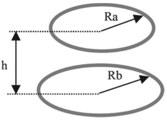 Here, M is the mutual inductance, μ0 is the vacuum permeability, N1 is the number of turns of the receiver coil, N2 is the number of turns of the transmitter coil, Ra is the radius of the inner turn of the receiver coil, Rb is the radius of the inner turn of the transmitter coil, and h is the distance between the coils.