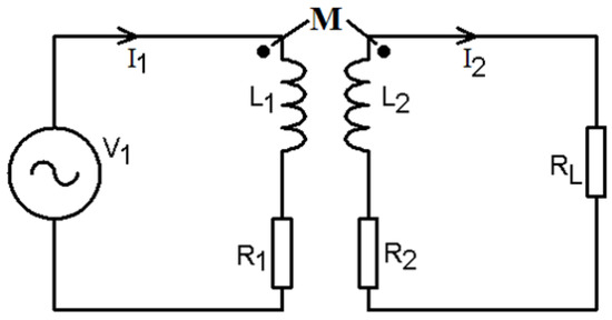 Since coils are used in inductive coupling WPT systems, the system inherently becomes inductive. The inductance increases with the frequency of the source, contributing to a low power factor and increased losses. Compensation becomes necessary to enhance the power factor, requiring the connection of capacitors to both the transmitter and receiver sides. The transferred power can be amplified up to 50 times by compensation [32]. To understand the significance of compensation, the uncompensated equivalent of the system must be considered. In Figure 3, the transmitter and receiver coils are shown as a winding and a resistor. The system can be described with Equations (3) and (4) [31].