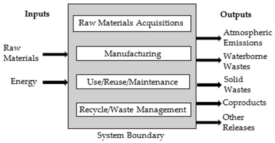 A life cycle assessment (LCA) is necessary to evaluate the environmental impacts of WPT systems. An LCA assesses the entire life cycle of a product adopting a “cradle-to-grave” approach to evaluating industrial systems. The “cradle-to-grave” concept begins with the extraction of raw materials from the earth to create the product and concludes when all materials are returned to the environment. An LCA offers a comprehensive view and precise evaluation of the environmental aspects of a product or process throughout the product’s life cycle. The term “life cycle” refers to the key activities that occur throughout the life of the product, spanning from its production and its use and maintenance, including the acquisition of raw materials essential for production, to its final disposal. Figure 5 illustrates the potential life cycle stages considered in an LCA along with the inputs/outputs typically measured [46].
