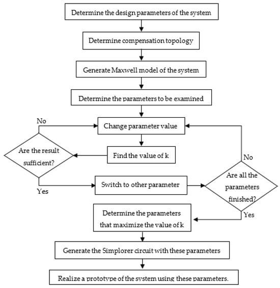 The flow chart of the implemented inductive WPT system methodology is presented in Figure 6. The initial step involves determining the design parameters. This includes defining the characteristics of the battery to be charged (voltage, power, and resistance). Subsequently, the selection of the voltage source and switching elements for charging the battery, determination of the number of windings for the transmitter and receiver coils, and specification of the conductor cross-sections are established. The second step entails determining the compensation topology with the SS topology selected in this study. The next step is to generate the Maxwell model of the system. Parameters to be examined, which total four in this study, are then identified. The subsequent step involves altering the first parameter and determining the corresponding k value for each parameter value. This process is repeated for all four parameters. Following an examination of these parameters, the parameters yielding the highest k values are determined, and a system prototype is constructed using these optimized parameters.