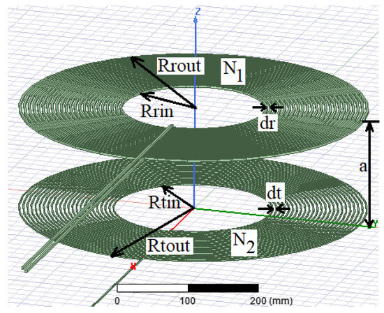 Figure 2 illustrates the dimensions of the circular coil used for a mutual inductance calculation. The mutual inductance of the circular coil can be computed using Equations (1) and (2) [31]. Lateral misalignment changes the mutual inductance, significantly impacting the system’s coupling coefficient and efficiency.