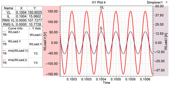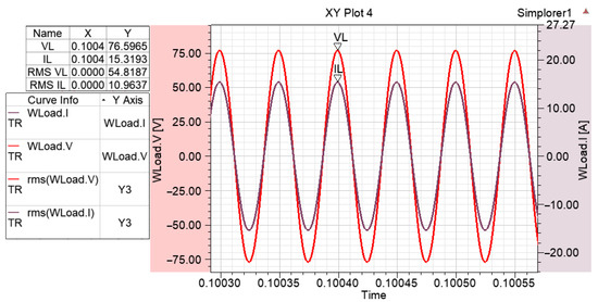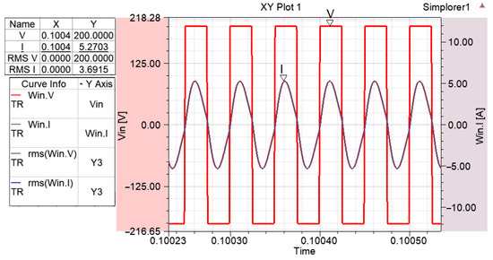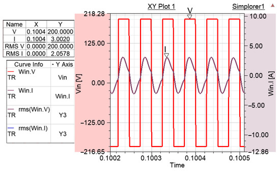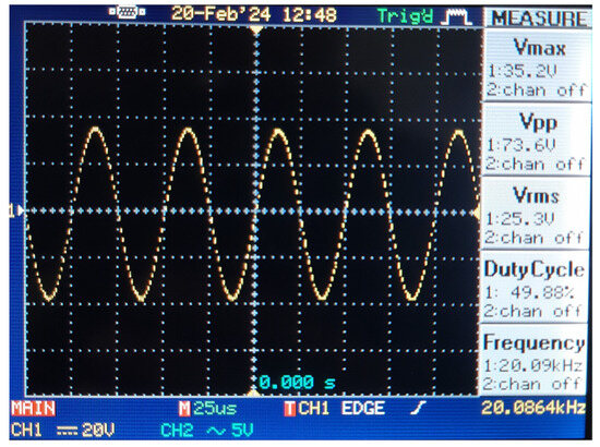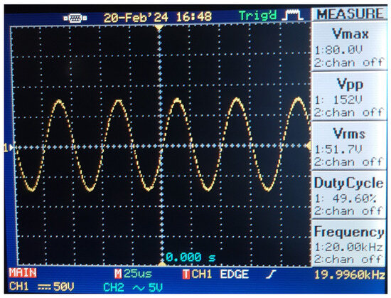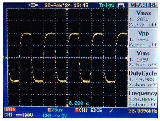 After the prototype of the system was implemented, the voltage applied to the transmitter winding and the voltage induced in the receiver winding were measured for RL 2.5, 5, and 10 Ω, and the results obtained are given in Figure 23, Figure 24, Figure 25 and Figure 26 and Table 9.