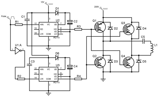 Given the relatively low voltage between G-E and the relatively high voltage between C-E, the IGBTs should be isolated [56]. To achieve this, an IGBT driver, such as IR2113, is utilized. The circuit diagram of the inductive coupling WPT system is shown in Figure 19.