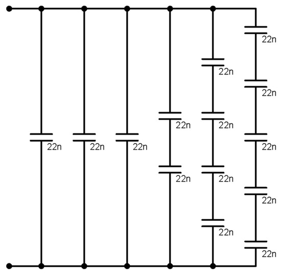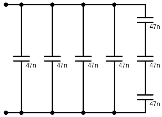 The image of the system prototype is shown in Figure 20. In Figure 21, capacitor C1 was obtained by connecting 22 nF capacitors (C1 = 86.9 nF). In Figure 22, capacitor C2 was obtained by connecting 47 nF capacitors (C2 = 203.66 nF).