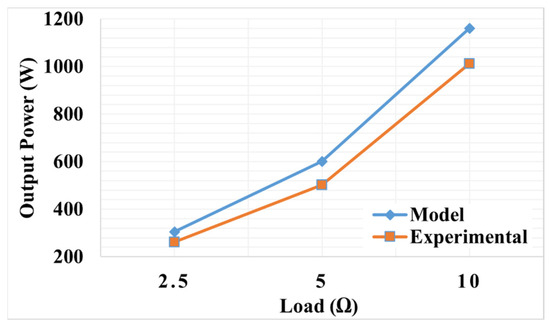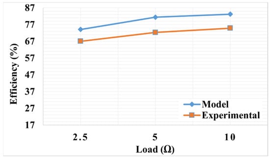 Subsequently, a prototype of the system with a high coupling coefficient was constructed. The outcomes from experimental studies were compared with those obtained from the model, and the results are presented comparatively in Figure 27, Figure 28 and Figure 29. As illustrated in Figure 27, both the model and experimental study demonstrate an increase in input power as the load resistance increases. Similarly, Figure 28 indicates that as the load resistance increases, the output power rises in both the model and experimental study. Moreover, as depicted in Figure 29, the efficiency of the system also increases with the rise in load resistance, observed in both the model and experimental study.