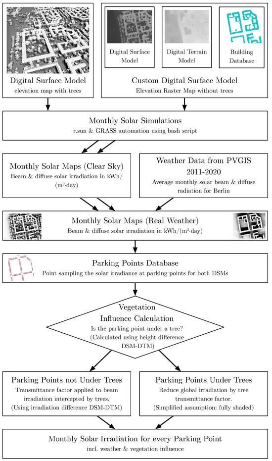The methodology of this study is presented in the following subchapters, starting from the input parking point data (Section 3.1), the development of the custom Digital Surface Model (Section 3.2), the solar simulation and solar maps (Section 3.3), integration of vegetation (Section 3.4), and the assumptions about the solar yield model and vehicle solar system (Section 3.5). A condensed overview of the methodology is shown in Figure 1.