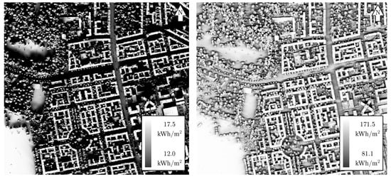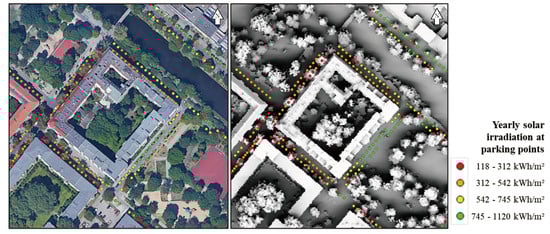 In Figure 5, a detailed image shows how the developed model can accurately distinguish irradiation values influenced by buildings and trees. Out of the 48,827 parking points, there are 18,223 located vertically under the radius of a tree crown, which amounts to 37% of the parking points. These parking points show a significant shading loss in this model because of the tree transmittance factor described in Section 3.4, especially in the summer months.