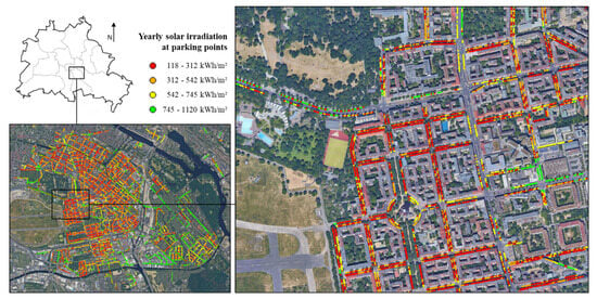 Yearly solar irradiation at parking points in the study area Berlin-Neukölln (left). A clos-eup shows the Schillerkiez area (right). For visualization purposes, the red points symbolize the lower 40% of parking points, while the other colors represent 20% of parking points each, according to the legend.
