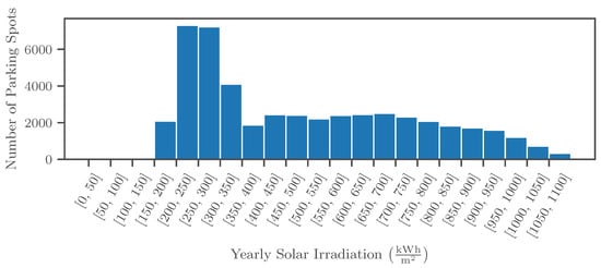 Figure 4 shows a histogram of the parking points by their yearly received irradiation. It is noticeable that there is a high concentration of data below 350 . Nearly all of these rather unfavorable parking points are located directly under a tree and/or are heavily shaded throughout the year.