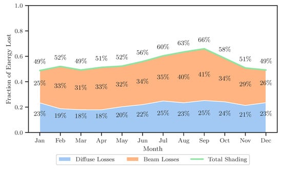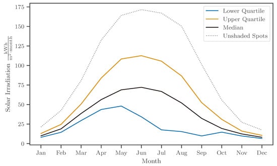 In Figure 6, the monthly solar irradiation is shown with the characteristic Northern Hemisphere irradiation peak in the summer months. It should be pointed out that there are very few parking points that are unshaded throughout the year. The upper quartile (75th percentile) is subjected to 38% of shading losses, while the median receives 61% of shading losses. The lower quartile (25th percentile) losses amount to a substantial 76%, which is also caused by a heavy dip of irradiation during the vegetation period from June to September, when tree crowns are fully developed.