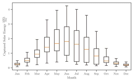 In Figure 8, the energy captured per month is shown. In winter, the energy is low for all of the parking points, while in summer, there is a wide spread between favorable sunny parking points and heavily shaded points. This correlates to a greater variability of irradiation throughout the city in the summer.