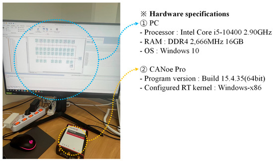 In this section, we use experiments with events that may occur on the Korean roads designed. We propose lane change restrictions based on density. Figure 2 shows the experimental environment. In a PC environment, the CPU is i5-10400 and the RAM is 16GB. The operating system is Windows 10 environment. The version of CANoePro is Build 15.4.35 (64bit). The configured RT kernel is windows-x86.