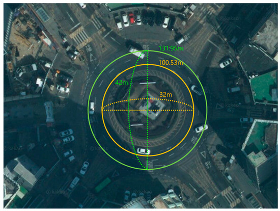 This paper discusses the role of the roadside units (RSUs) and how they interact with autonomous vehicles. The RSUs are important components of transportation infrastructure and exchange information with autonomous vehicles through vehicle-to-infrastructure (V2I) communications [10,11]. This communication provides vehicles with important information such as real-time traffic conditions, road conditions, and safety-related warnings, increasing vehicle operating efficiency and improving traffic safety. As shown in Figure 1, we experimented with how to reduce traffic congestion and improve traffic flow by interacting with vehicles within a radius of roughly 700 m, considering the performance of the RSUs we own. The reason for calculating 700 m is that RSU is also used as a network model, and the network is generally divided into honeycomb-shaped boundaries [12,13]. Because it is located outside the road, there is a limit to the impact when there are many lanes.