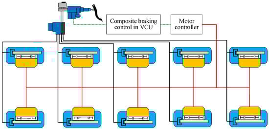 Different from the common two-axle-drive vehicles, as shown in Figure 1, the electric wheel-drive multi-axle heavy-duty vehicle studied in this paper is a five-axle vehicle in the 10 × 10 form, which is driven by 10 hub motors with a single-step gear. The composite braking system of this vehicle is composed of the hydraulic braking system and the motor braking system for each axle. The composite braking system can switch and distribute electric braking and hydraulic braking through the booster motor, push rod mechanism, and other components of the serial braking system. Therefore, the hydraulic braking torque of each axle is adjusted by the pressure regulator, and regenerative braking of the hub motor for each axle is adjusted by the motor controller, which receives the command of the composite braking control in VCU. The detailed parameters of the vehicle are shown in Table 1.