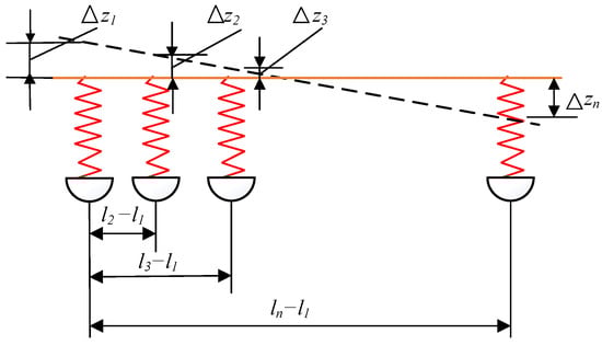 Compared with two-axle vehicles, the braking dynamics of multi-axle vehicles have changed, so it is necessary to analyze the braking dynamics in conjunction with the structural characteristics of multi-axle vehicles. For the super-static problem brought about by the multi-axle vehicle dynamics model, the braking force condition on the horizontal road surface with the adhesion coefficient φ is shown in Figure 2, under the conditions of ignoring the rolling drag moment, air resistance, and inertial drag moment generated by the deceleration of the vehicle’s rotating mass. In this paper, the equivalent stiffnesses of the suspension and tires are simplified to the vehicle spring stiffness, and a linear braking dynamics model of a multi-axle vehicle coordinated with suspension deformation is established [23], which can accurately analyze the braking dynamics of multi-axle vehicles.