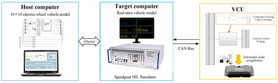 In order to verify the effectiveness of the proposed multi-mode composite braking control strategy for electric wheel-drive multi-axle heavy-duty vehicles, a hardware-in-the-loop simulation platform was established as shown in Figure 5. The dynamics model of 10 × 10 electric wheel-drive multi-axle heavy-duty vehicles was set up in the Host computer by using Matlab/Simulink, and the compiled real-time vehicle model was deployed to the Target computer real-time simulator through the ethernet to simulate various movements during vehicle operation. Meanwhile, a multi-mode composite braking control strategy was developed by using Simulink and integrated into the vehicle control strategy, which was deployed to the VCU (vehicle control unit) through rapid code generation technology. The VCU and real-time simulation machine transmit the control signals and vehicle status signals through the CAN bus. On this basis, a single-stop braking condition and cycle condition were selected to verify the performance of the multi-mode composite braking control strategy.