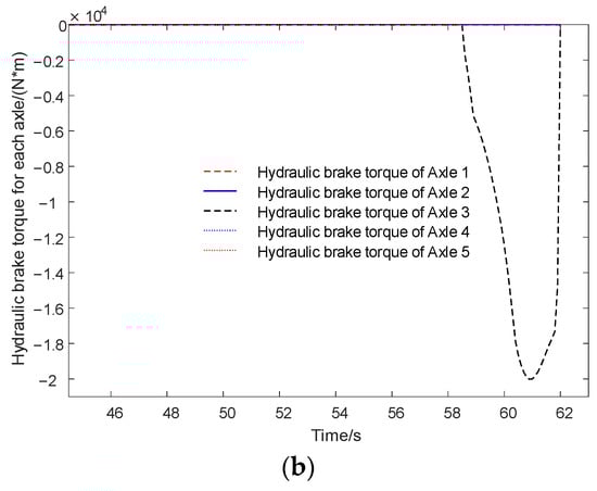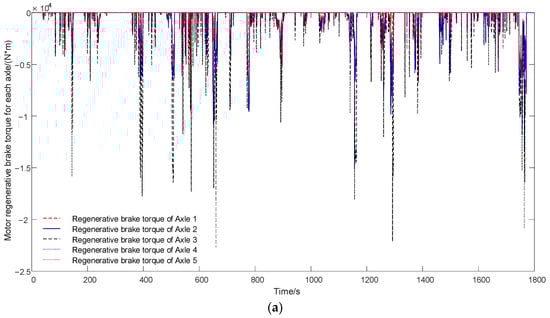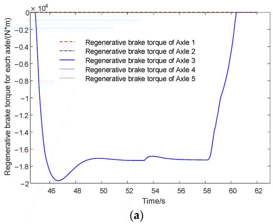 Torque distribution of fully electric braking condition. (a) Regenerative brake torque for each axle. (b) Hydraulic brake torque for each axle.