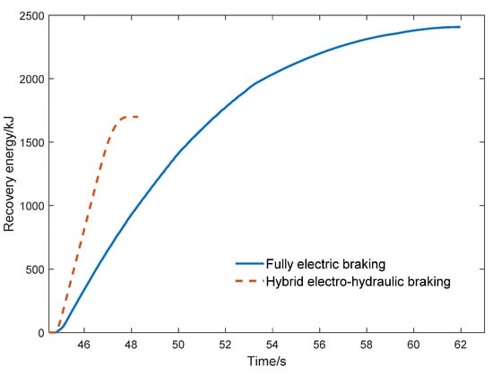 After analyzing the braking torque distribution under the two braking conditions, as well as Figure 9 and Table 2, it can be seen that part of the braking energy is recovered through the motor regenerative braking in the two braking conditions by using the composite braking control strategy in this article. The energy recovery rate reaches 39% in fully electric braking condition, which is higher than that in electro-hydraulic hybrid braking, which was an energy recovery rate of 27.5%. Therefore, the multi-mode composite braking control strategy proposed in this article works effectively in different types of single-stop braking conditions, and can improve the braking recovery energy and braking stability by optimizing the distribution of hub motor braking torque and hydraulic braking torque between each axle.