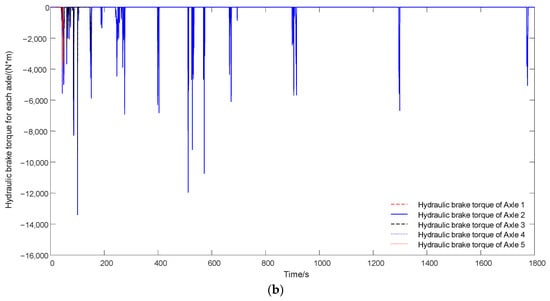 Braking torque of electric braking and hydraulic braking on each axle in the CHTC-HT. (a) Regenerative brake torque for each axle. (b) Hydraulic brake torque for each axle.