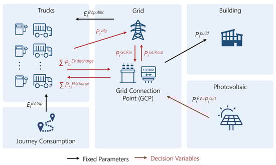 Controlled and bidirectional charging has recently become an extensively discussed topic. A variety of publications that deal with this technology predict its high relevance in the near future [,]. The Original Equipment Manufacturers (OEMs) have discovered its importance as well, and the first bidirectional vehicles are on the market []. Nevertheless, past considerations have mostly revolved around battery-electric vehicle (EV) passenger cars and not focused on battery-electric heavy-duty trucks (BETs). However, taking into account that heavy-duty and bus traffic is responsible for 6% of all European greenhouse gas emissions, a major wave of electrification in this area is necessary []. Registration statistics show that this area is still dominated by diesel vehicles, while BETs represent only 1.5% of the current truck market []. Various challenges impede the market roll-out of BETs. These challenges include the high acquisition costs and the limited availability of grid connection capacity in depots []. The use of controlled and bidirectional charging can address these challenges by reducing operating costs and the required grid connection capacity []. When evaluating the requirements for controlled and bidirectional charging, BETs offer several advantages over passenger cars. Due to the higher charging power and the bundling of many vehicles in one depot, a high marketable capacity can quickly be achieved at one location. The use of bidirectional charging in BET depots can exploit these advantages and support the roll-out of BETs, making the research topic of this paper highly relevant.