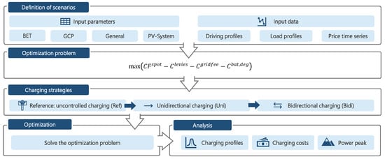 The sequence of the used optimization model eFlame is illustrated schematically in Figure 3. After importing the input parameters and input data described below, the optimization problem is set up. The optimization problem is solved sequentially considering the charging strategies: uncontrolled charging (ref), unidirectional charging (uni), and bidirectional charging (bidi). The results are examined separately for each charging strategy.