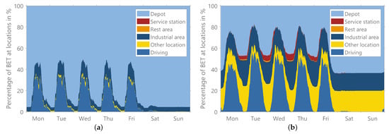 Layered percentage of BETs at different locations over the week. (a) Local Transport cluster, (b) Regional Transport cluster.