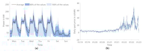 In addition to the driving profiles, the load profile of the building of the depot is another important input for the optimization. The used load profile shown in Figure 5b for an average week relies on real data of the depot. From the annual time series, the average was determined for each quarter-hour of the week as well as the ranges in which 80% and 100% of the values lie. The plot shows that there are significant load peaks in the evening hours on weekdays, indicating suitability for peak shaving. The load is significantly lower at weekends and at night than it is during the day on weekdays.