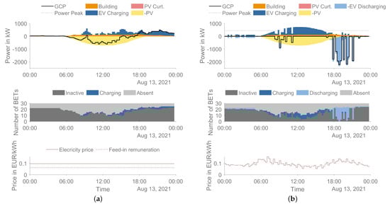 Results for an example day for different charging strategies.: (a) reference, (b) bidirectional.