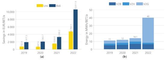 The results of the base scenario are compared with those of the other examined years in Figure 7. Figure 7a shows the annual savings for the optimization with unidirectional (uni) and bidirectional (bidi) BETs. The savings are calculated from the difference between the costs in the reference simulation and the respective charging strategy and are normalized per vehicle. Before 2021, the savings are modest at about 2000 EUR/BET even with bidirectional vehicles. As energy prices rise from 2021 (cf. Figure 5), savings also increase significantly. Thus, almost 3300 EUR/BET can be achieved in 2021 with the bidirectional and 1500 EUR with the unidirectional charging strategy. In 2022, the savings skyrocket up to more than 10,000 EUR/BET. On the one hand, this can be explained by the fact that the reference costs in 2021 and 2022 rise due to the higher prices. On the other hand, the increasing price spreads and falling levies are responsible for the high savings, as this makes arbitrage trading significantly more attractive. In comparison, the authors of [] estimate lower savings of 1515 EUR/BET. The deviation mainly results from the simplified price time series they use, which does not adequately reflect realistic price spreads of the spot market.