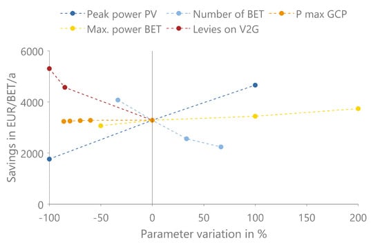 To examine the influence of individual parameters on the results, the results of the sensitivity analysis for the bidirectional charging strategy are shown in Figure 8. In the sensitivity analysis, we varied various parameters that could impact the savings. Depending on the results, the values of these sensitivity parameters are selected iteratively. The diagram shows the percentage deviation of the sensitivity parameters from the parameters of the base scenario on the x-axis and the annual savings on the y-axis. The absolute values of the sensitivity parameters are provided in the last column of Table 2. The point in the diagram where the parameter variation is zero contains the savings of the base scenario already shown in Figure 7 (2021). The reduction of the grid connection capacity has the least impact on the savings. With the limitation of 700 kW (parameter variation = 86%), the grid connection capacity is still large enough and the savings decrease only minimally. A reduction of below 700 kW would reduce the savings more significantly, but then the PV system (1 MW peak) has to be curtailed. More points are calculated for this parameter to determine the boundary where no curtailment occurs. The savings decrease without a PV system but increase with a larger PV system. With higher charging and discharging power, savings can be increased. In the analysis, the charging power of 300 kW (parameter variation = 200%) leads to increased savings above 3700 EUR per BET. A larger number of vehicles reduces the savings per vehicle. The parameter with the strongest impact on the savings is the levies on the energy fed back. In the base scenario, we assume the worst case for V2G without any exemption from levies for energy fed back into the grid. Therefore, is set equal to . With full exemption (), the annual savings per BET strongly increase to 5300 EUR. However, these savings are only possible with a significantly higher, discharged energy from the BETs to the grid.