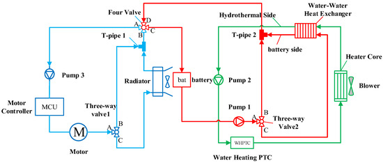 The integrated thermal management system is shown in Figure 1, and includes three main thermal management system cycles: motor thermal cycle, battery thermal cycle, and cabin heating cycle. The motor thermal cycle includes a motor, MCU, and a pump. By controlling the three-way valve 1, the switching of the internal and external cycles is achieved. For example, the motor coolant flows through the AB port of the three-way valve 1, which can achieve an internal cycle and quickly raise the coolant temperature; the motor coolant flows through the AC port of the three-way valve 1, achieving an external cycle, which can fully utilize the radiator to cool the motor or battery. The battery thermal cycle includes a water–water heat exchanger and a pump, where the heat exchanger is the node between the battery cycle and the cabin heating cycle, using the positive temperature coefficient (PTC) heater to heat the battery. By controlling three-way valve 2, the battery coolant flows from A to C, and the heat exchanger can be used to exchange heat with the PTC heater. The battery coolant flows through the AB port of the three-way valve 2, thereby stopping the battery cycle heating. As this paper mainly focuses on the heating function of batteries, the air conditioning refrigeration circuit is not included in this structure. The cabin heating cycle includes a pump, PTC heater, heater core, and blower. The PTC heater is used to provide heat to the cabin through the heating core. In addition, when the four-way valves AB and CD are connected, the motor thermal cycle and the battery thermal cycle are independent of each other. When the four-way valve AD and BC are connected, the motor thermal cycle and battery thermal cycle are connected in series, which can use the heat from the motor to heat the battery or use the radiator to cool the battery. According to the heating/cooling requirements of the motor, battery, and cabin, the integrated thermal management system scheme has ten operating modes, as shown in Table 1. In addition, the operating state of the main components for each operating mode is shown in Table 2.