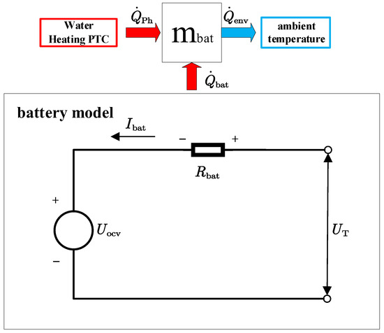 Li-ion batteries’ internal resistance and open-circuit voltage are nonlinear functions of temperature and SOC, and the temperature and SOC of the battery are correlated with battery charging–preheating costs. Therefore, modeling of battery heat production and charging is required. The thermodynamic processes of the battery pack in the low-temperature charging–preheating scenario mainly include: