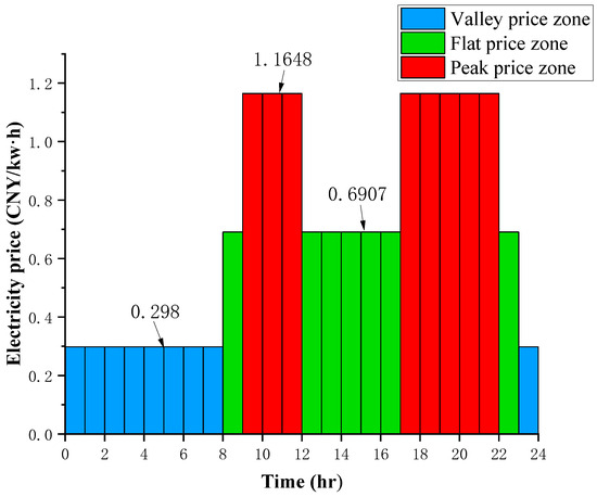 The main objective of this paper is to reasonably utilize grid energy from charging stations to charge and preheat pure electric vehicle batteries. The aim is to guarantee that the batteries attain the desired state of charge and the temperature for the user’s target departure time while minimizing the overall energy consumption cost from the grid. The working conditions of the time-of-use electricity price are fixed, and mainly include valley, flat, and peak price zones, as shown in Figure 3. Considering that battery temperature and SOC can characterize the current state of the battery, they are selected as state variables with the following expressions: