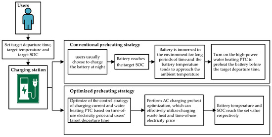 In daily life, the electricity price of the grid fluctuates over time. According to the principle of the lowest electricity cost, the strategy of preheating the battery pack by the charging pile can be adjusted according to the time-of-use (TOU) electricity price. However, at present, the TOU electricity price is mainly applied to optimizing pure EV charging loads and guiding users’ charging and discharging behaviors [21,22,23]. OuYang et al. [24] proposed a multi-objective optimization charging strategy covering user travel demand, charging cost, energy loss, and other aspects using the time-of-use electricity price. Simulation results show that this strategy not only fully meets the charging needs but also significantly reduces the charging cost and energy loss. However, it only considers the effect of the time-of-use electricity price on the charging cost but does not involve the cost effect of preheating batteries.