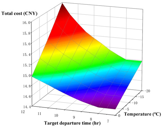 This study used the MATLAB (R2022b) simulation platform to complete the modeling of the thermal management system and the realization of optimal control, and then draws the following conclusions. The optimized total cost increases as the ambient temperature decreases and the user’s target departure time increases, as shown in Figure 7. This is because colder temperatures require more electrical energy to heat the battery to the target temperature. If the target departure time is delayed, the heat generated by preheating the battery during the valley price period will gradually dissipate. For the battery to reach the set temperature value, it needs to increase the turn-on time of the PTC heater in the flat and peak zones, so the total cost consumption is higher.