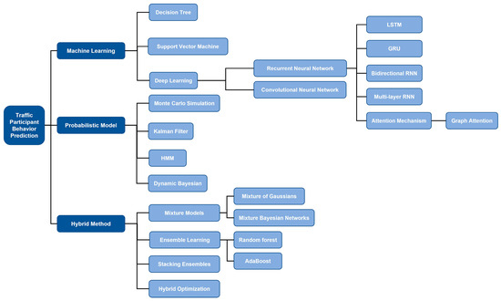 The prediction of intersection traffic participant behavior can be categorized into three research methods: machine learning-based methods, probabilistic model-based methods, and hybrid method-based methods [8]. This section reviews these three research methods. Figure 2 provides details on the subclasses included in machine learning, probabilistic modeling, and hybrid methods.