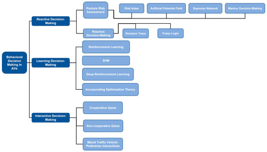 Drawing on the existing research, behavioral decision-making can be classified into three categories: reactive, learning, and interactive. Figure 3 presents a summary of the relevant studies.