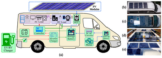 PV generation systems applied to RVs and different operating scenarios: (a) supplementation methods for RV storage batteries, (b) system consisting of the same type of PV modules, (c) system consisting of the different types of PV modules, (d) scenario of PV modules shaded by fallen leaves, and (e) scenario of partially shaded PV module.
