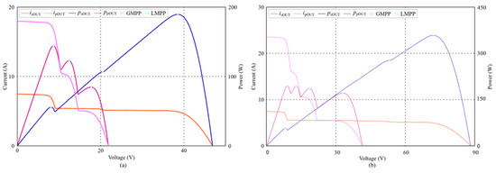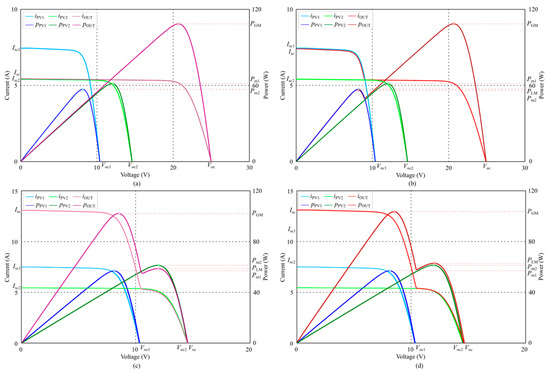 On the other hand, the output characteristics curve of parallel-connected PV modules presented in Figure 3c indicates that the open-circuit voltage Voc is slightly smaller than Voc2 in the absence of a reverse diode (RD). When the output voltage is lower than Voc1, the output current iOUT is equal to the sum of iPV1 and iPV2. However, when PV1 reaches its maximum power, the parallel-connected PV modules exhibit a global maximum power PGM, where Pm1 is less than PGM, and PGM is less than the sum of Pm1 and Pm2. When the operating voltage exceeds Voc1, the output current iOUT is lower than iPV2, and when PV2 reaches its maximum power, the output maximum power of the two PV modules is PLM, which is less than Pm2. By introducing an RD, as displayed in Figure 3d, the output characteristics are modified. When the output voltage is lower than Voc1, the global maximum power PGM is the same, while the operating voltage exceeds Voc1, the output current iOUT is equal to iPV2, and when PV2 reaches its maximum power, the output maximum power of the two modules is PLM, approximately equal to Pm2.