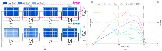Mismatch of a PV generation system with the same type of PV modules under partial shading conditions: (a) system structure and (b) output characteristics.