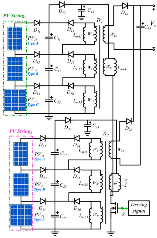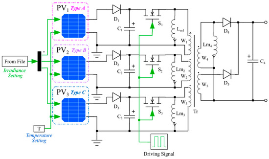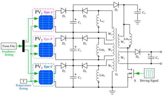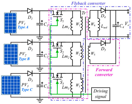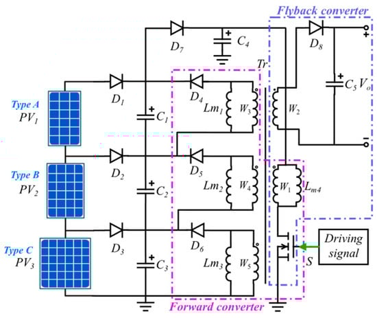 Figure 6 depicts the proposed current equalizer utilized in the series connection of PV modules. This circuit combines both forward and flyback converters with a shared transformer, which serves to enhance efficiency. Through the parallel connection of their outputs, a consistent voltage output is attainable, concurrently diminishing the voltage pressure on the secondary rectifier. This approach leads to a more streamlined and effective design, particularly in cases where galvanic isolation is necessary. Although the primary winding configuration may be somewhat intricate, it facilitates the provision of multiple inputs as needed [32]. In the circuit, the primary winding W1, capacitor C4, and power switch devices S are shared. The forward converter, consisting of secondary windings W3–W5, excitation inductors Lm1–Lm3, and diodes D4–D6, is responsible for equalizing the current among the PV modules in series. On the other hand, the flyback converter, composed of secondary winding W2, diode D8, and capacitor C5, facilitates power transmission to the load.