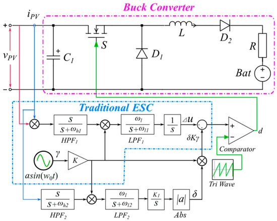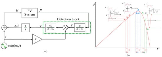 Figure 9a illustrates the approach for implementing MPPT using the sinusoidal ESC [23], which closely resembles the traditional perturbation and observation algorithm. In this approach, the perturbation signal γ is denoted as γ = asin (ω0t) and is introduced into the operating voltage of the PV generation system. In the detection block, a high-pass filter that isolates the AC power signal g from the output power multiplies the AC power signal g by the signal Kγ and extracts its DC component v using a low-pass filter, and then integrates v to obtain the perturbation direction signal Δu.