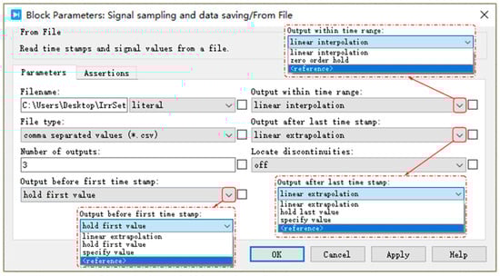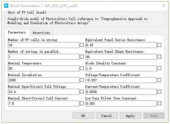 Simulation models of four types of PV modules listed in Table 1 have been developed using PLECS [37]. These models are based on the single-diode model of the solar cell shown in Figure 2b and utilize the characteristic parameters provided in Table 1. Figure 11 displays the parameter setting interface for the simulation model corresponding to a type-A PV module, with the parameter settings for the other types of modules being similar to Figure 11.