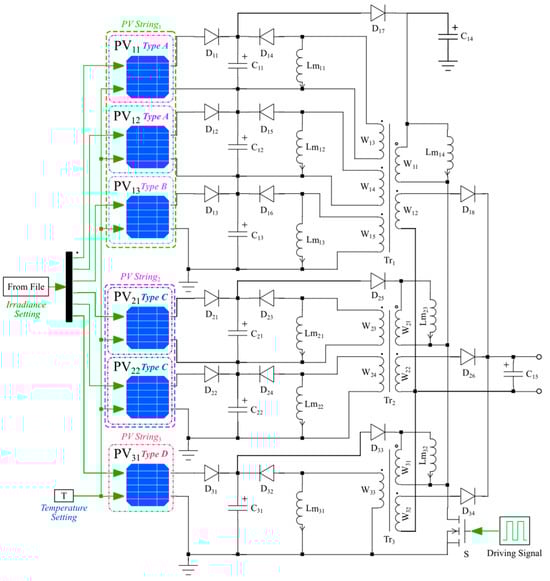 Figure 12 depicts the model of the current equalizer for series-connected PV modules. PV modules PV1–PV3 are linked to capacitors C1–C3 through reverse diodes D1–D3. The equalization branch is also connected to capacitors via diodes D4–D6. Power switch S is connected to capacitor C4 through primary winding W1. The output of the circuit comprises secondary windings W2, diode D8, and capacitor C5. The temperature of each PV module is determined by a constant block T, and the irradiance is regulated using the ‘From File’ block, which will be elaborated upon in the simulation section.