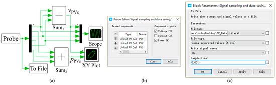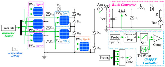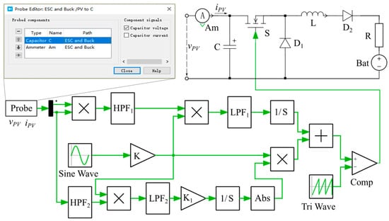 In Figure 15, the chart illustrates the MPPT control and power converter model utilized to achieve the maximum power of the PV generation system. The ‘Probe’ block plays a critical role in sensing the power, voltage, and current parameters of multiple devices or PV modules. Specifically, in Figure 15, the ‘Probe’ block is depicted detecting the voltage vPV across capacitor C.
