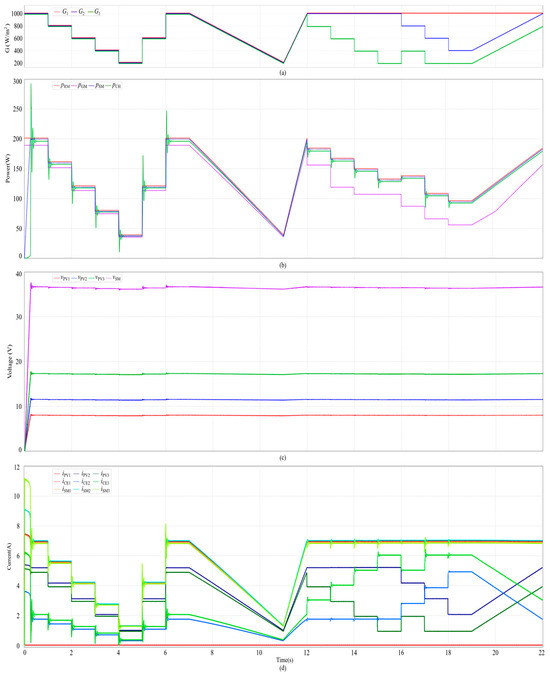 Simulated waveforms of series-connected PV system: (a) irradiance of each PV module and the various (b) powers, (c) voltages, and (d) currents.