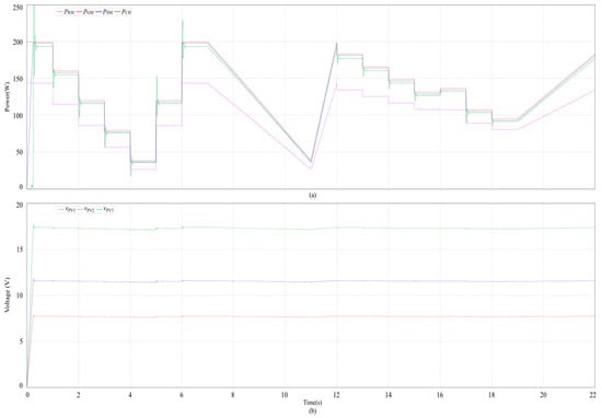 The simulation results of the parallel-connected PV generation system are presented in Figure 21. Figure 21a shows that the pSM and pCH are slightly smaller than pRM, while the pGM is significantly smaller than these values. This highlights the crucial role of the voltage-matching circuit in enhancing the output performance of PV modules and the overall system efficiency. The waveforms of the output voltage of each PV module, as depicted in Figure 21b, further support this observation, where after stabilization, the output voltage of each PV module stabilizes at its maximum operating voltage.