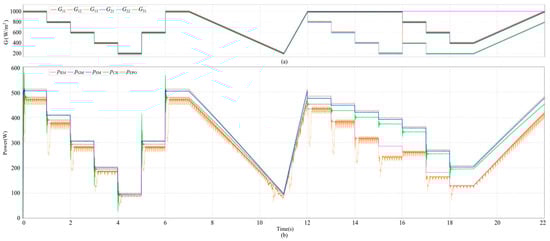 Simulated waveforms of mixed-connection PV generation system: (a) irradiance of each PV module and (b) various powers.